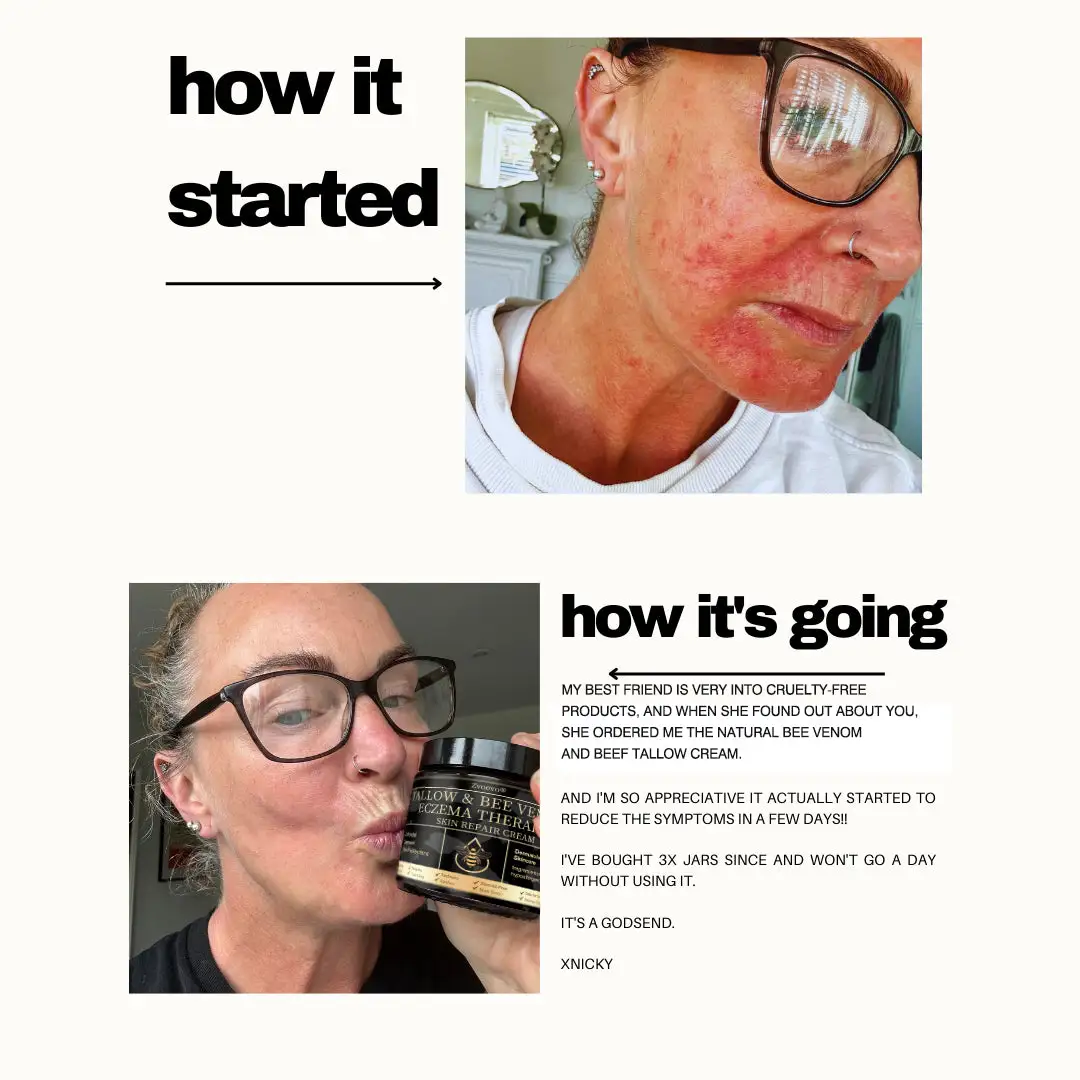 “Iโve battled stubborn psoriasis for years, from my face down to my neck. I tried everything โ prescription creams, steroid ointments, medicated soaps, even painkillers to survive flare-ups โ but nothing worked long-term. Then I tried ๐๐ฏ๐จ๐๐ฏ๐จยฎ Eczema Therapy Cream with Tallow & Bee Venom. Within weeks, the redness and flakes started to improve, the burning eased, and after 3 weeks, my skin finally looks normal. I can go out without hiding my face, and I feel confident again. This cream really gave me my life back.” โ โญโญโญโญโญ Caroline Hughes