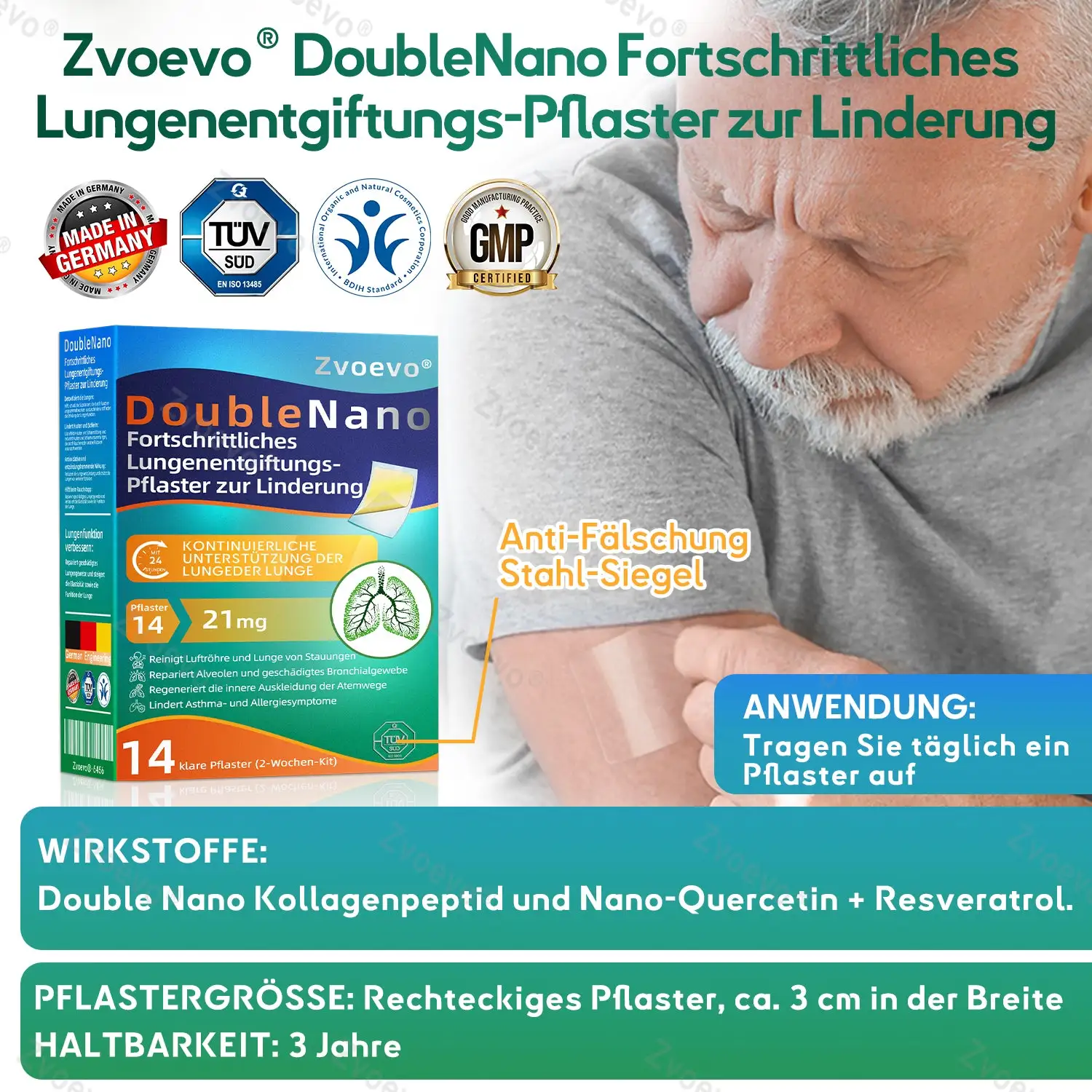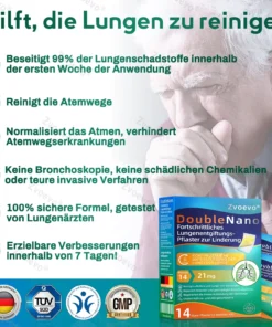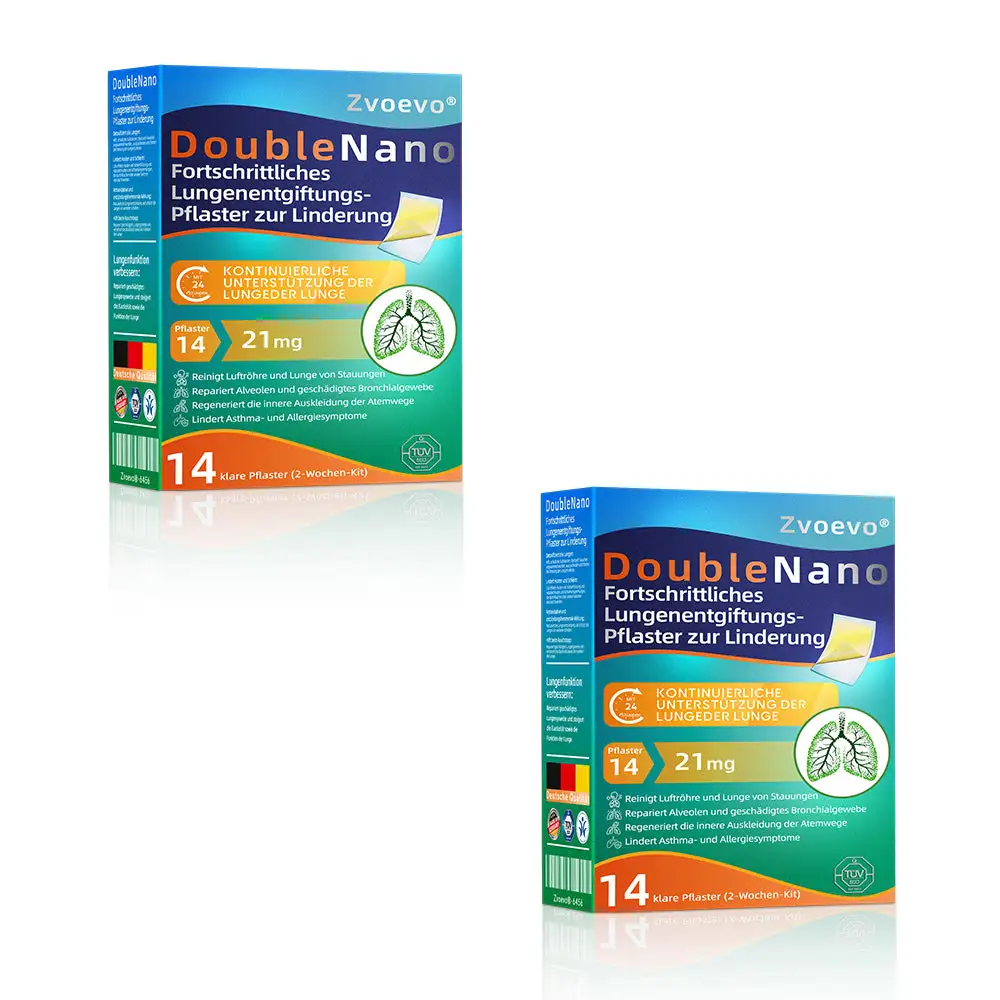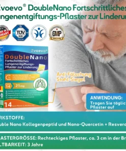 Die einzigartige Doppel-Nano-Formel aus Nano-Quercetin + Resveratrol und Nano-Kollagenpeptiden im Nano-Lungenreinigungspflaster bietet starke antioxidative und immunstรคrkende Vorteile. Diese Wirkstoffe bilden eine Schutzschicht in den Atemwegen und der Lunge und unterstรผtzen die Reparatur geschรคdigter Zellen. Bei regelmรครiger Anwendung stรคrken sie die Widerstandskraft des Atmungssystems, reduzieren die Auswirkungen รคuรerer Krankheitserreger, beugen Atemwegsinfektionen vor und fรถrdern die allgemeine Lungengesundheit.