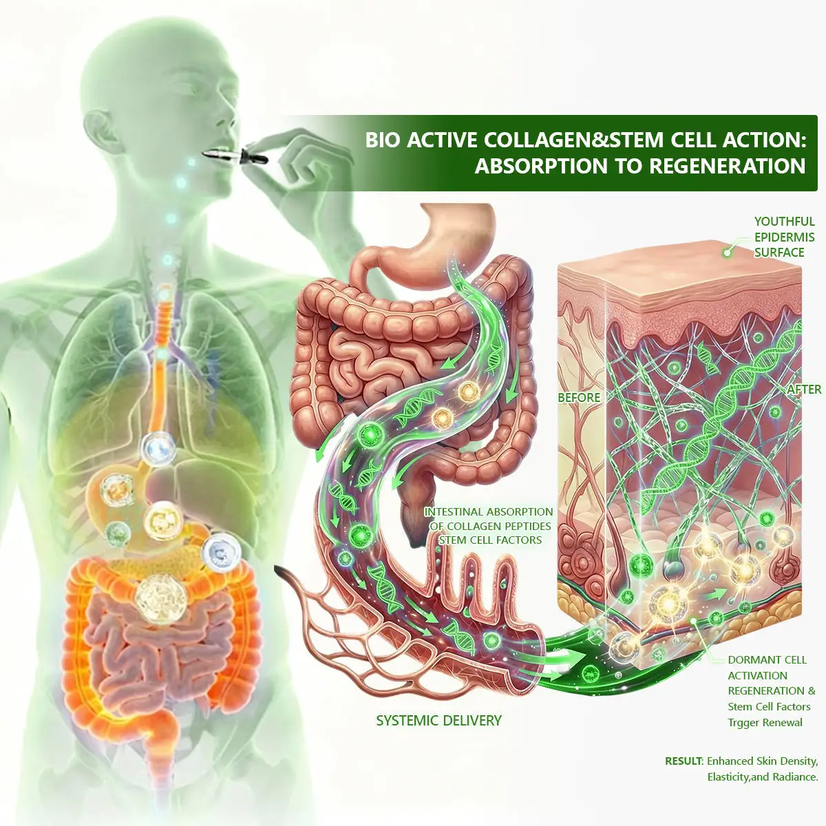 After you take an oral skin nutritional supplement, its active ingredients are absorbed through the intestines and enter the bloodstream. This initiates a full-body “skin rejuvenation journey.” The bloodstream transports these highly active nutrient molecules to the dermis, where they precisely target key skin cellsโfibroblastsโsending them biological signals to “accelerate production.” This directly stimulates the synthesis of youth-supporting substances like collagen and elastin, while also strengthening the skin’s internal hydration network. Additionally, the supplement aids the body in combating oxidative damage caused by daily metabolism. This represents a biological process that systemically improves skin health and vitality from the inside out.