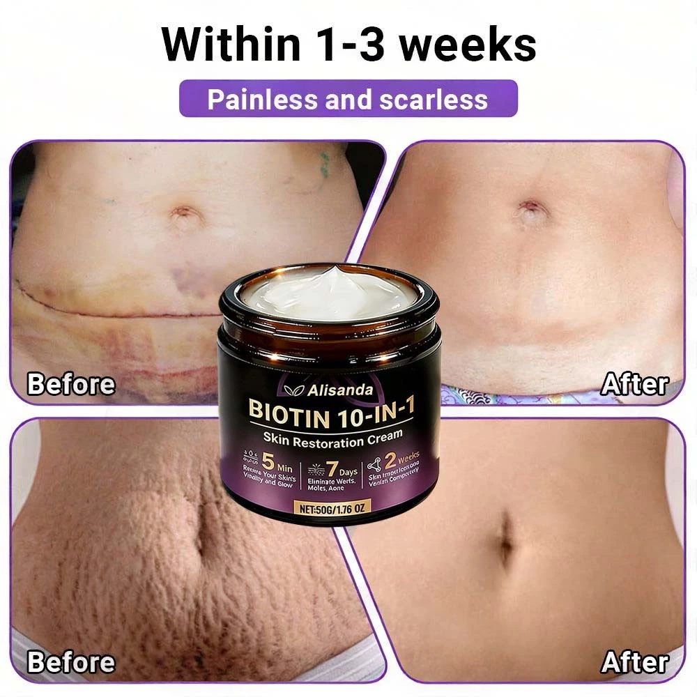Scars, stretch marks, and acne marks often form due to collagen breakdown and inflammatory damage in the deeper layers of the skin. Alisanda® Biotin 10-in-1 Skin Restoration Cream combines Centella Asiatica and collagen peptides to promote skin regeneration and repair — studies show scar depth can reduce by up to 42% within 14 days. Niacinamide and salicylic acid help calm redness and balance oil production, while aloe vera and colloidal oatmeal soothe irritation.
