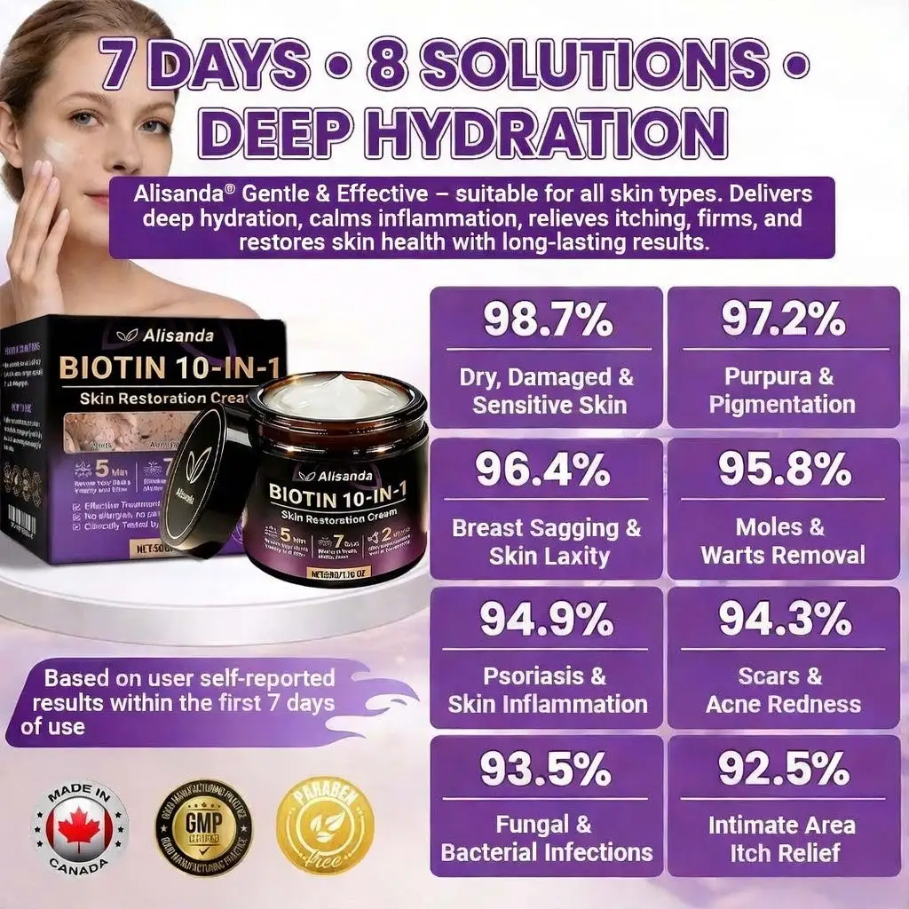 Therefore, Alisanda® Biotin 10-in-1 Skin Restoration Cream was scientifically developed under rigorous standards. Its formula combines the restorative power of natural biotin and collagen, synergized with hyaluronic acid, vitamin C, centella asiatica, and over ten other potent bioactive ingredients. Together, they deliver multi-dimensional care — from deep hydration and barrier repair to anti-inflammatory relief, itch control, metabolic renewal, tissue restoration, and anti-aging nourishment. Clinically validated and produced in GMP-certified facilities compliant with Canadian safety standards, this cream offers a safe, effective, and drug-free multi-repair skincare solution for dryness, inflammation, irritation, and signs of aging — restoring comfort, resilience, and lasting skin health.