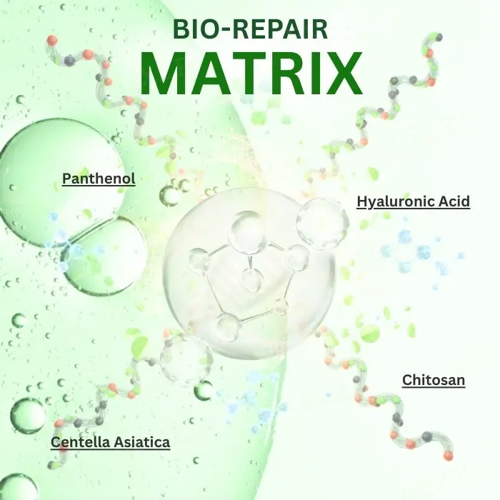 A powerful repair network combining Hyaluronic Acid, Chitosan, Centella Asiatica, and Panthenol. Hyaluronic Acid deeply moisturizes, Chitosan forms a breathable protective barrier, Centella strengthens tissues, and Panthenol accelerates recovery.