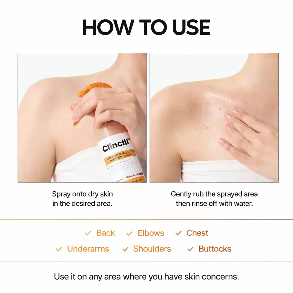 Say goodbye to rough patches and hello to a clean, refined finish. Clinclii™ helps reduce the look of dullness, smooth uneven texture, and support visible skin renewal with consistent use. Powered by exfoliating acids and brightening support, this easy spray fits seamlessly into your routine — because great skin shouldn’t be complicated.