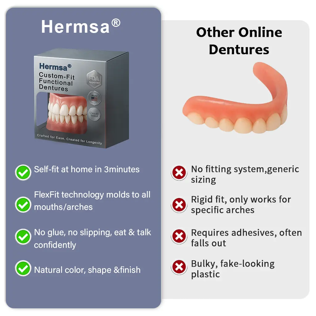 Hermsa® AdaptableFit Custom-Fit Functional Dentures are the closest at-home system we’ve seen to clinical-grade custom fitting. Its gel layer protects the alveolar ridge, promotes natural pressure distribution, and improves oral function over time.”