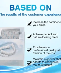 🌟 Easy fit, seamless comfort: Get a perfect set of dentures that cover irregular, missing, crooked, chipped or discoloured teeth. Enjoy dentures that fit your mouth perfectly from the moment you put them on – regardless of your dental area. Our state-of-the-art thermo-reversible material ensures a tight, secure fit without the need for adhesives and offers exceptional comfort that feels natural. Go about your day with confidence, free from discomfort or slippage, and enjoy eating, speaking and smiling with ease.