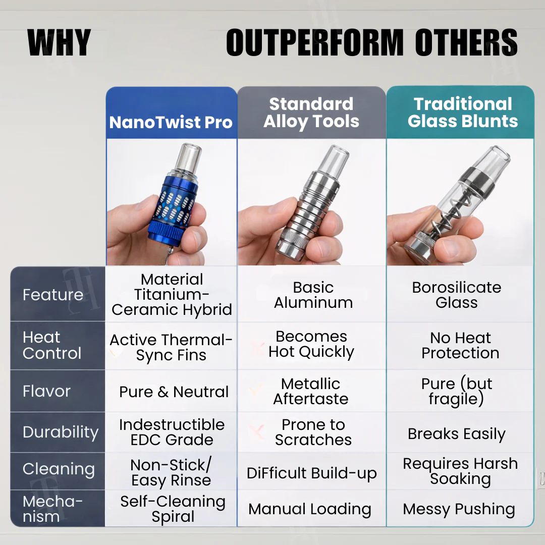 Most portable tools suffer from a “metallic taste” and overheating. We have engineered the TitanSpiral Pro—a medical-grade instrument designed for those who demand purity and performance. By utilizing Grade 2 Titanium and Zirconia Ceramics, we’ve eliminated the harsh heat and residue buildup common in basic aluminum tools.
