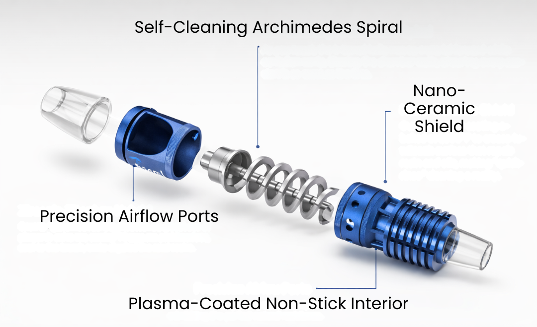 As you twist, the internal helix moves the material forward while simultaneously clearing the chamber walls, ensuring every session is as fresh as the first.