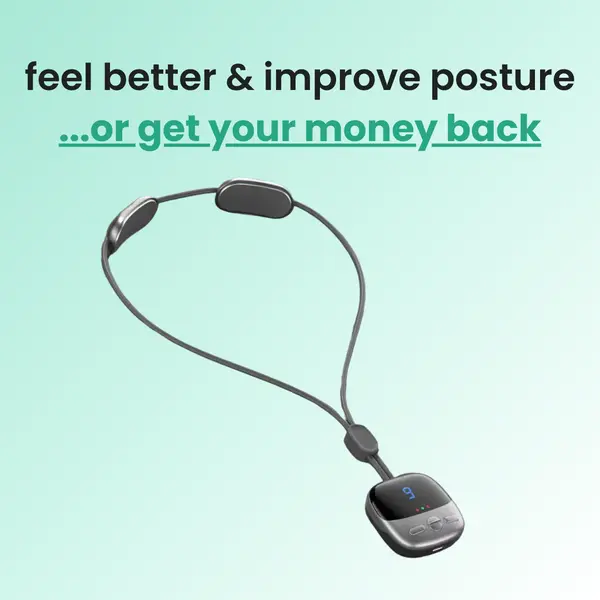 To restore the neck’s natural curve, we equipped our Pose massager with Heat & EMS; First, adjustable, soothing warmth decreases pain perception by activating receptors that reduce pain signals through the nervous system. Then, it widens the blood vessels in the neck area, allowing more fluid to pass through, which helps EMS to work optimally.