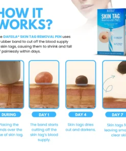 but most people avoid doctors because procedures are expensive, uncomfortable, and leave scars. Dafeila® Skin Tag Removal Pen penuses a gentle rubber‑band ligation method, just like professional clinics—but you control it. It safely cuts off the blood supply, drying the tag until it falls off—no pain or downtime.