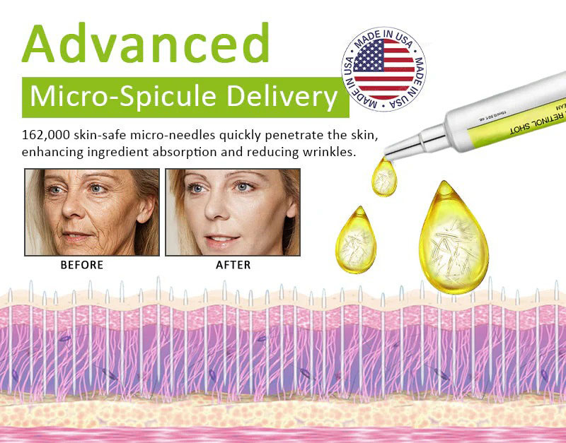 162,000 skin-safe micro-spicules per bottle, each just 1/16th the size of a pore, deliver active ingredients deep into the skin for faster, longer-lasting wrinkle lifting and firming. Clinically tested and manufactured in the USA in a GMP-certified facility, fully compliant with U.S. Cosmetic Safety Regulations.