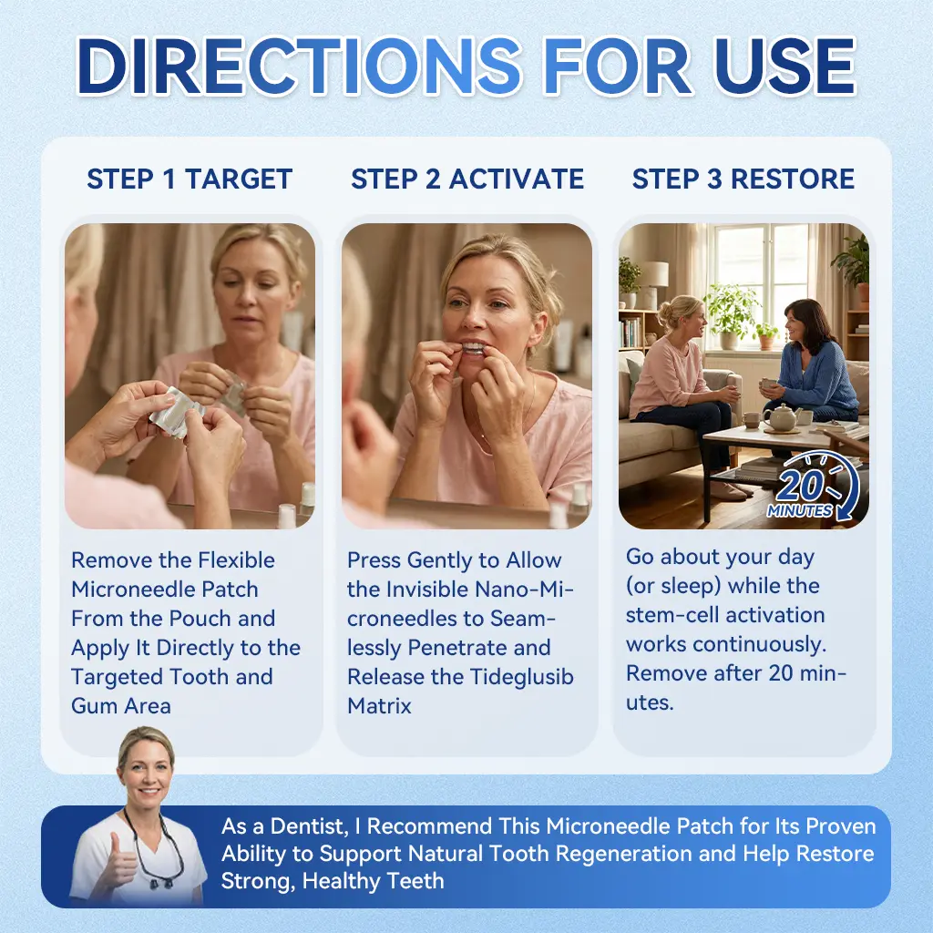 🎯 Apply: Place the flexible nano-microneedle patch directly onto the targeted tooth and gum area.
