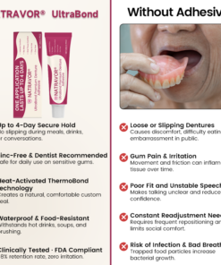 ✅ Waterproof and Mess-Free: Once set, the adhesive becomes completely waterproof and resistant to food particles, saliva, and heat. No sticky, pasty residue like gels or creams—NATRAVOR® keeps everything clean, fresh, and locked in place, even through hot meals and drinks.