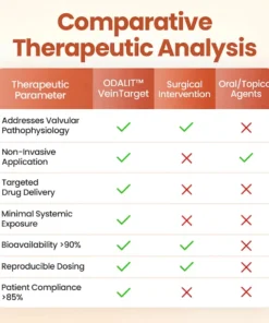 ODALIT™ VeinTarget represents the first commercially available transdermal phytotherapy system specifically designed to address venous valvular insufficiency through localized botanical intervention. Unlike systemic treatments that dilute active compounds throughout the circulatory system or topical applications that cannot penetrate the dermal barrier, our microneedle delivery system ensures concentrated therapeutic compounds reach the target tissue with minimal systemic exposure.